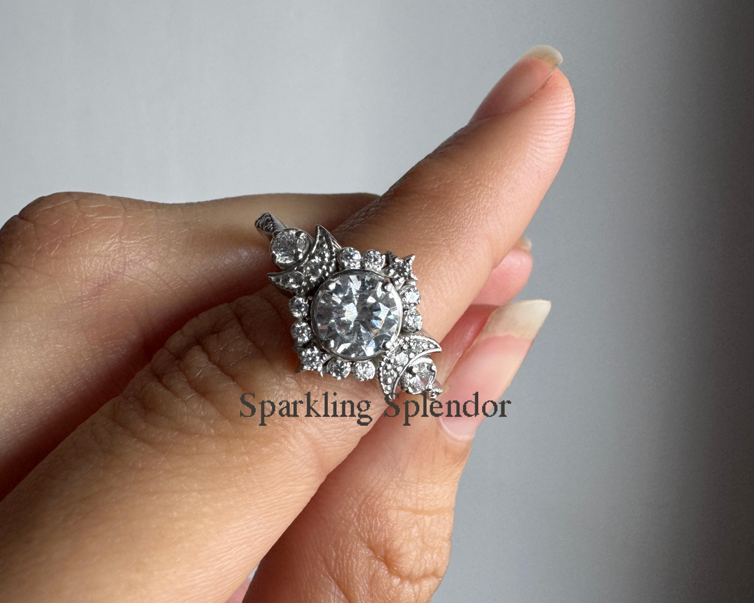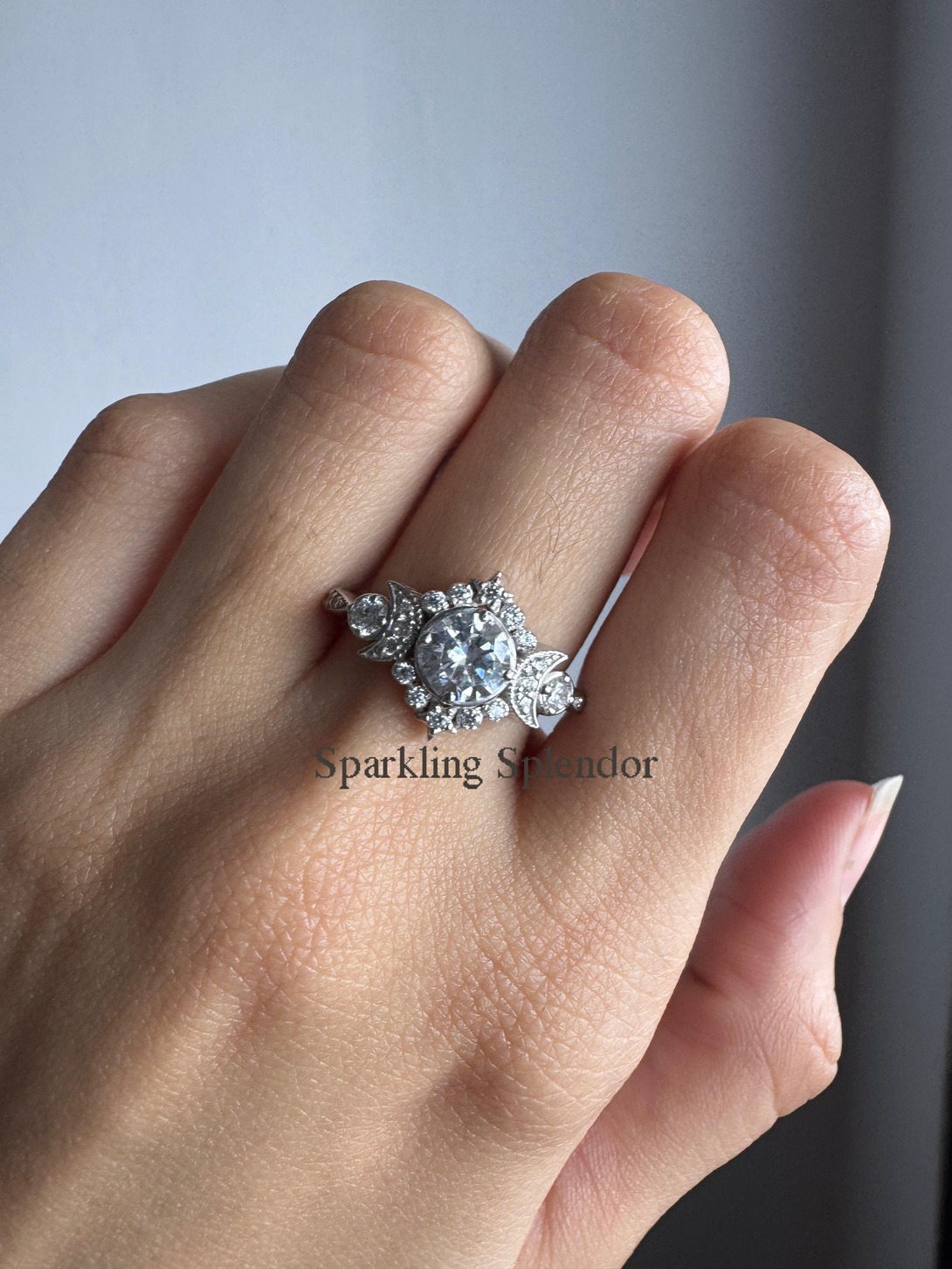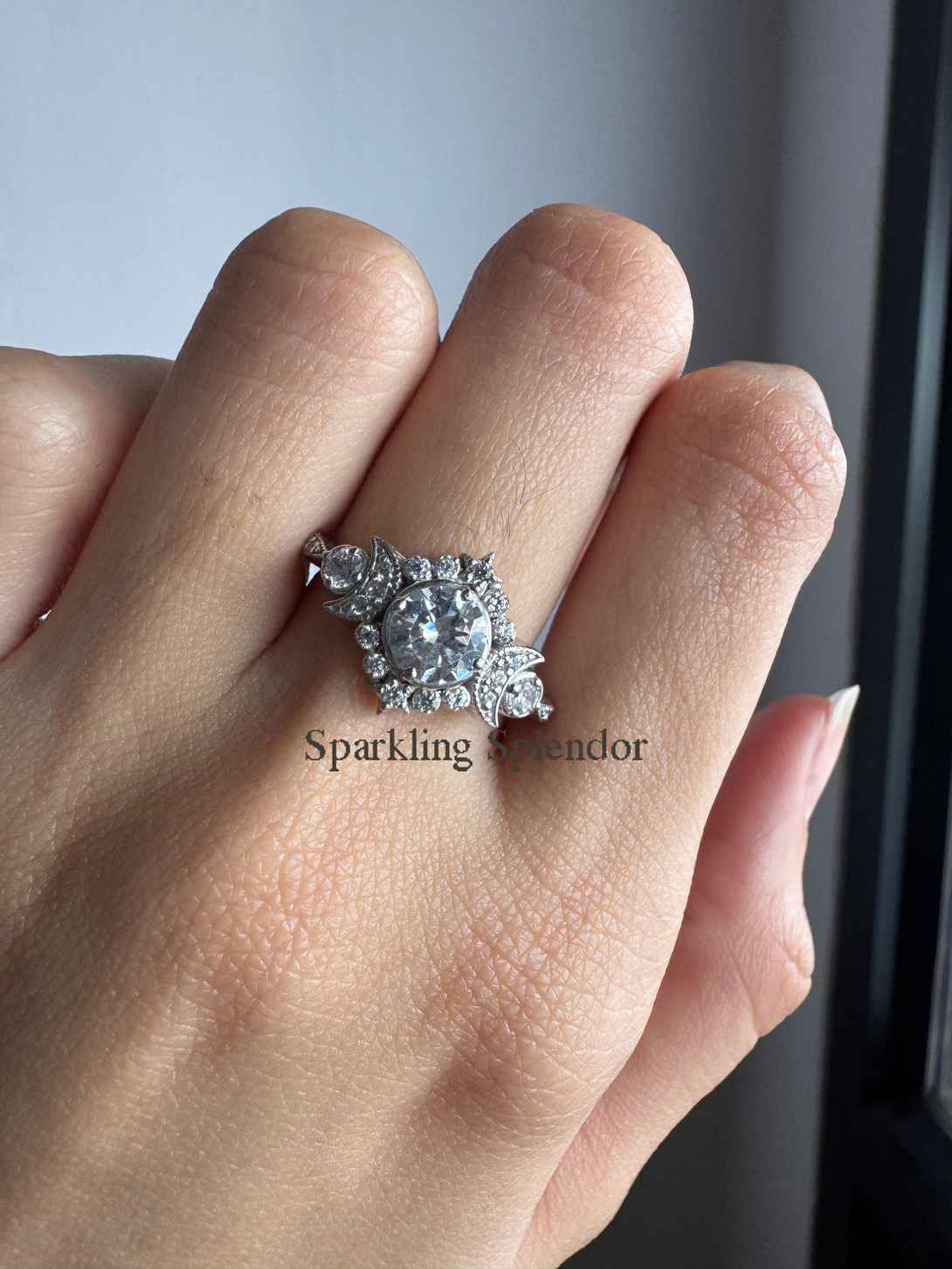 Round Cut Moissanite Engagement Ring Art Deco Vintage Inspire Wedding Her